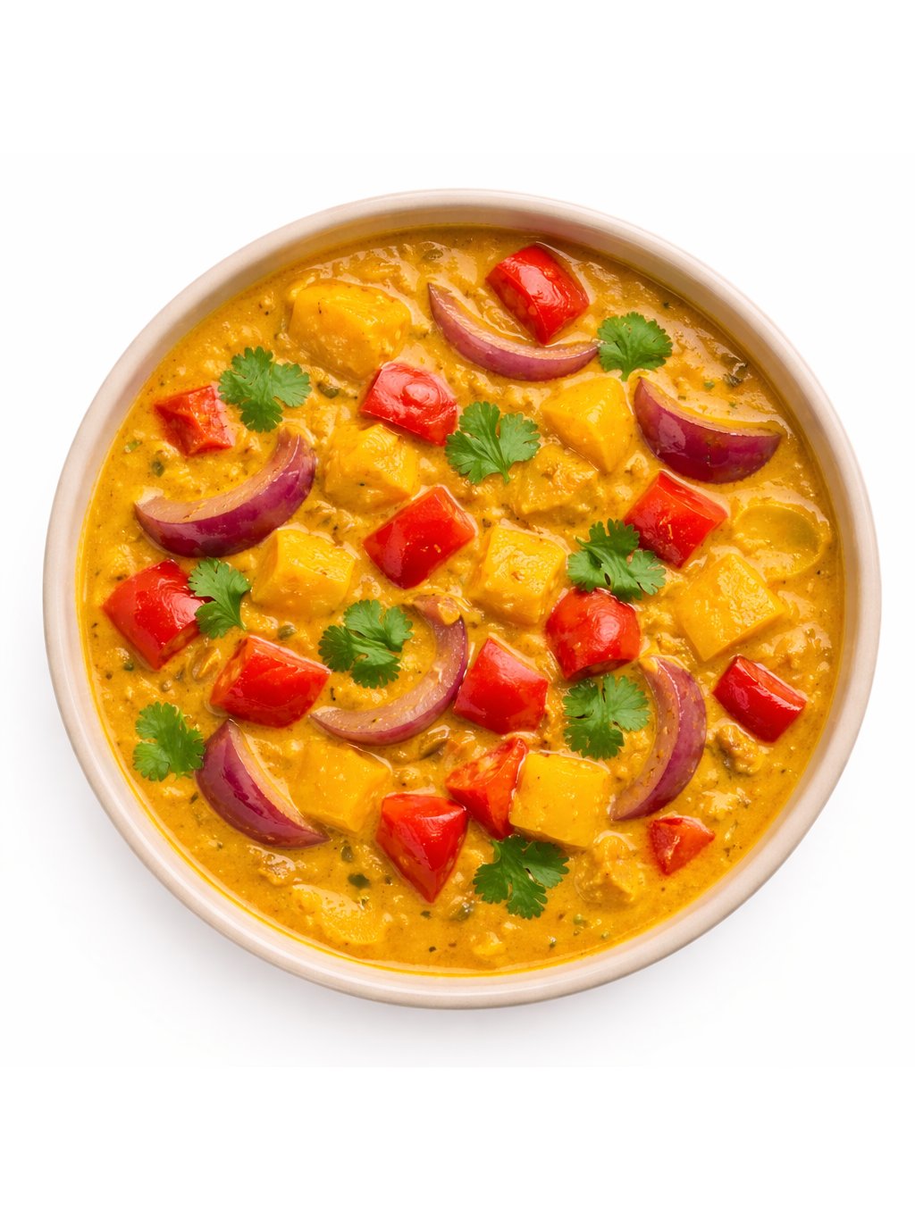 Červené curry s paprikou a červenou cibulí jako ideální večeře. Šokově zamrazeno. Stačí jen v rendlíku ohřát a máte hotovo.